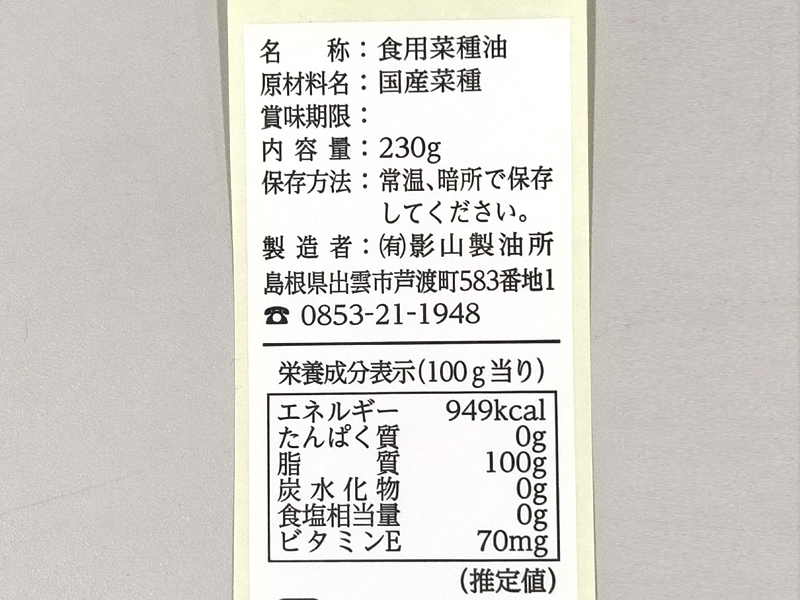 | 商品名(読み仮名) | いずものなたねあぶら230gぱうちいり |
