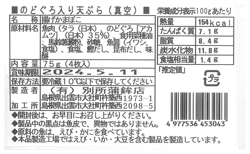 | 原料の産地 | 魚肉:タラ(日本) のどぐろ(日本) |