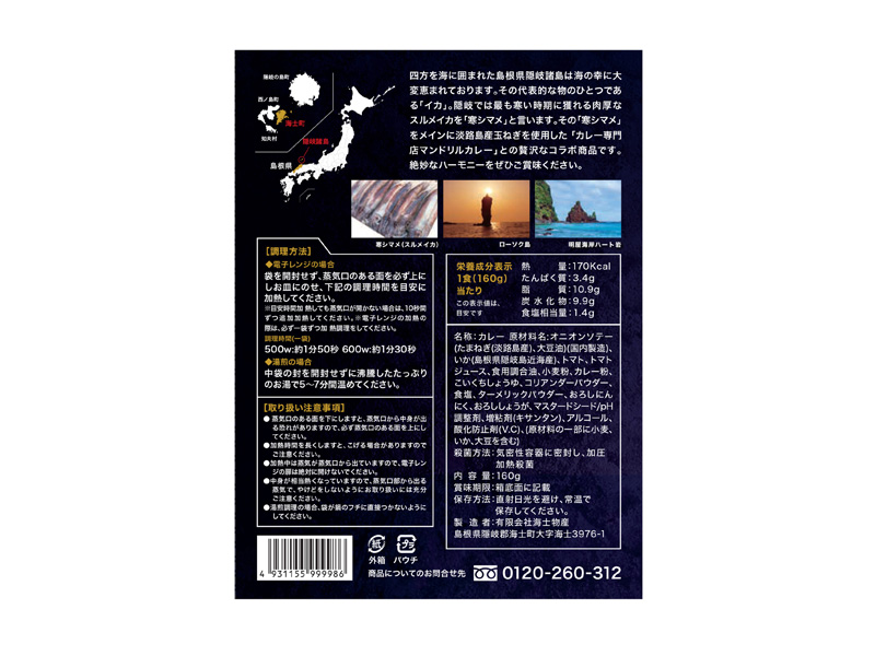 隠岐では最も寒い時期に獲れる肉厚なスルメイカを『寒シマメ』と言います。本品は寒シマメを中心に隠岐の島近海で獲れるヤリイカと淡路島産玉ねぎにこだわり、カレーは神戸市で有名なカレー専門店Mandrillさんと共同開発しました。アミノ酸等(うま味調味料)を使