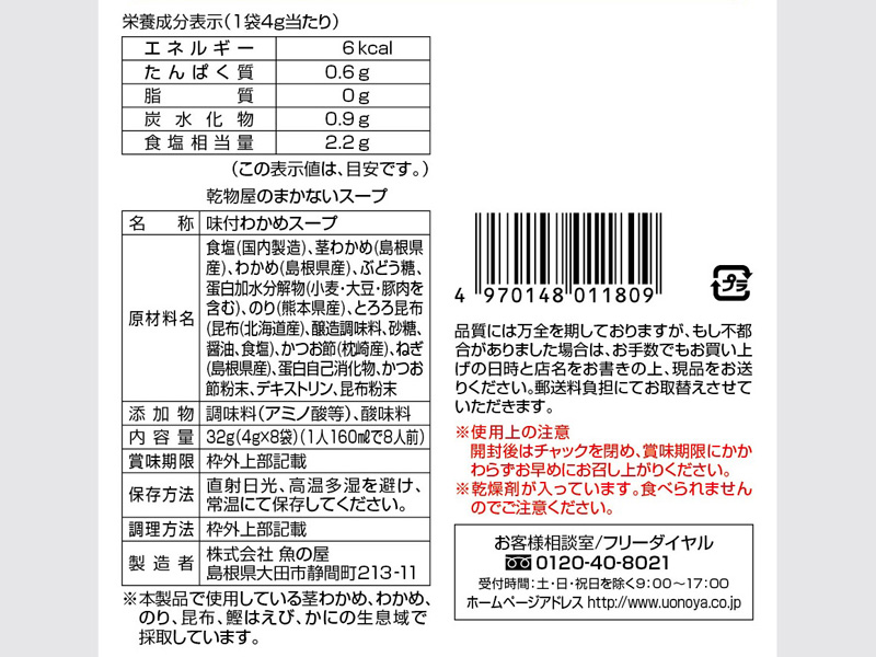 | 乾物屋のまかないスープ8g×4袋 | 32g | 80袋 |