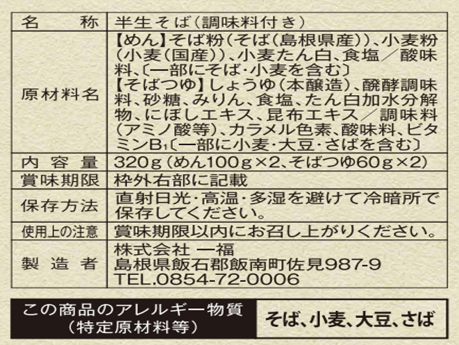 | 原材料 | めん【そば粉(そば(島根県産))、小麦粉(小麦(国産))、小麦たん白、食塩/酸味料、(一部にそば・小麦を含む)】 添付調味料【しょうゆ(本醸造)、醗酵調味料、砂糖、みりん、食塩、たん白加水分解物、にぼしエキス、昆布エキス/調味料(アミノ酸等)、カラメル色素、酸味料、ビタミンB1、(一部に小麦・大豆・さばを含む)】 |