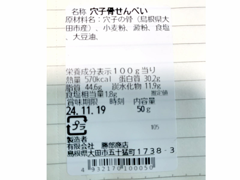 | 原料の産地 | 穴子の骨 (島根県大田市産) |