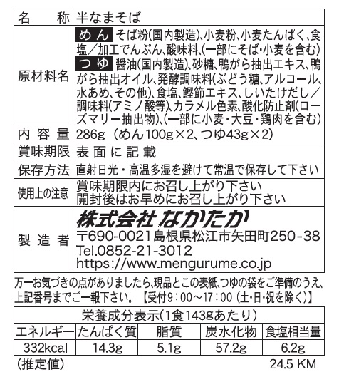 | 原材料 | 【めん】小麦粉、そば粉(国内産)、食塩、小麦たんぱく/加工でんぷん、酸味料 【つゆ】しょうゆ(本醸造)、発酵調味料、砂糖、水あめ、かつおぶしエキス、にぼしエキス、食塩、醸造酢、こんぶエキス/調味料(アミノ酸等)、カラメル色素、(一部に小麦・大豆を含む) |