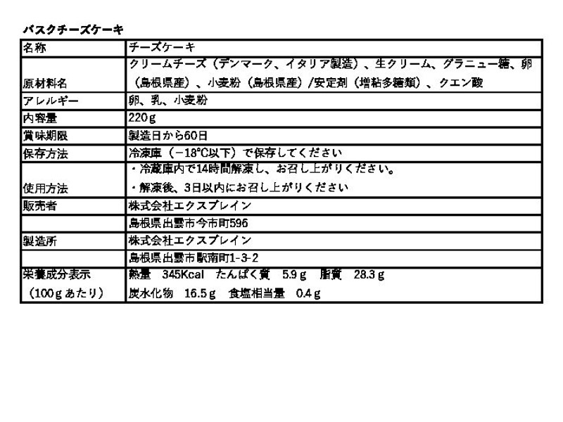 商品名(読み仮名) ばすくちーずけーき