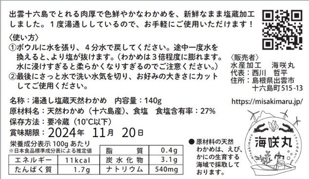 | 原料の産地 | わかめ(島根県出雲市十六島町産) |