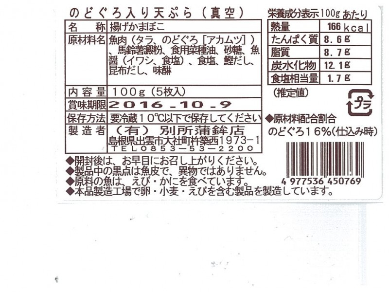 | 原材料 | 魚肉(タラ、のどぐろ「アカムツ」)、馬鈴薯澱粉、食用菜種油、砂糖、魚醤(イワシ、食塩)、食塩、鰹だし、昆布だし、味醂 |