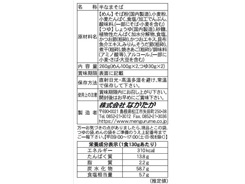 | 原材料 | 【めん】小麦粉、そば粉(国内産)、食塩、小麦たんぱく/加工でんぷん、酸味料 【つゆ】しょうゆ(本醸造)、発酵調味料、砂糖、水あめ、かつおぶしエキス、にぼしエキス、食塩、醸造酢、こんぶエキス/調味料(アミノ酸等)、カラメル色素、(一部に小麦・大豆を含む) |