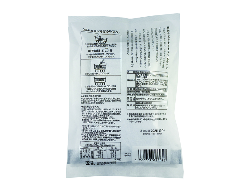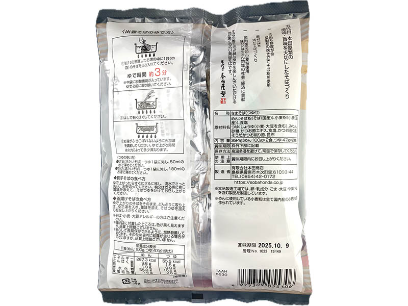 | 原材料 | めん:そば粉(そば(国産))、小麦粉(小麦(国産))、食塩 つゆ:しょうゆ(小麦・大豆を含む)、砂糖、食塩、みりん、削りぶし(かつお、さば)(さばを含む)、醸造酢(りんごを含む)、にぼし、酵母エキス |