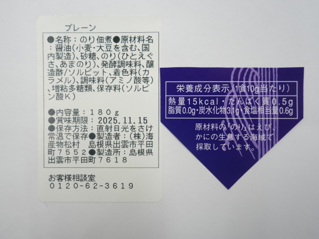 | 原材料 | 醤油(小麦・大豆を含む、国内製造)、砂糖、のり(ひとえぐさ、あまのり)、発酵調味料、醸造酢/ソルビット、着色料(カラメル)、調味料(アミノ酸等)、増粘多糖類、保存料(ソルビン酸K) |