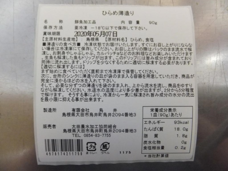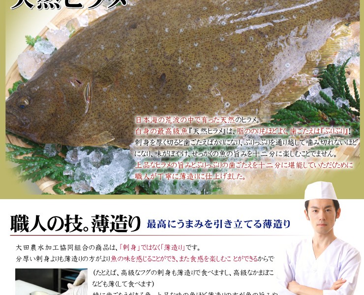 | 商品名(読み仮名) | 天然ひらめ薄造り (てんねんひらめうすづくり) |