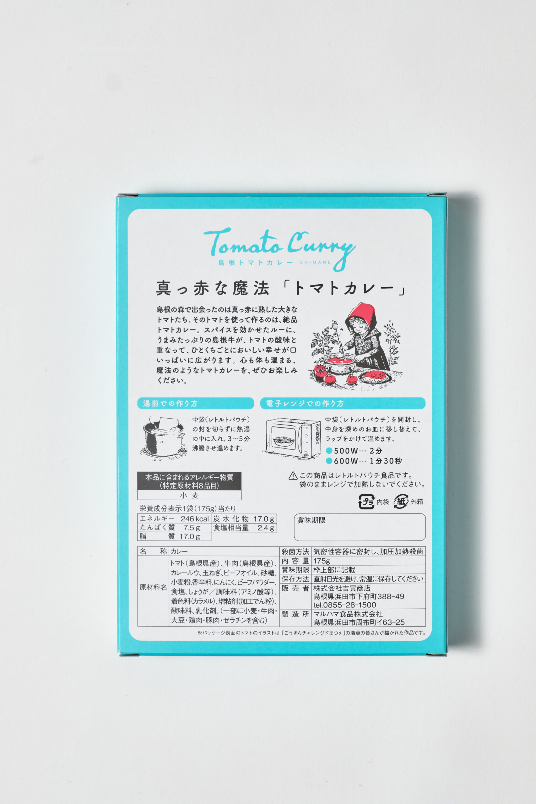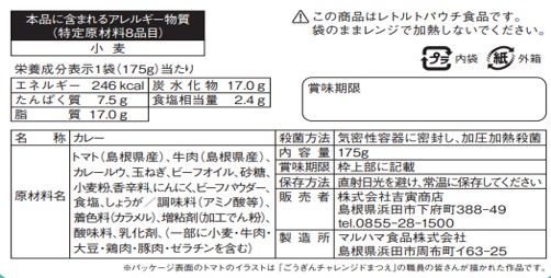 | 原材料 | トマト(島根県産)、牛肉(島根県産)、カレールウ、玉ねぎ、ビーフオイル、砂糖、小麦粉、香辛料、にんにく、ビーフパウダー、食塩、しょうが/調味料(アミノ酸等)、着色料(カラメル)、増粘剤(加工でん紛)、酸味料、乳化剤(一部に小麦・牛肉・大豆・鶏肉・豚肉・ゼラチンを含む) |