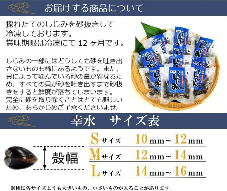 | 宍道湖産冷凍しじみLサイズ | 殻幅14mm~16mm 1kg | 10kg(1kg×10袋) |