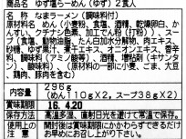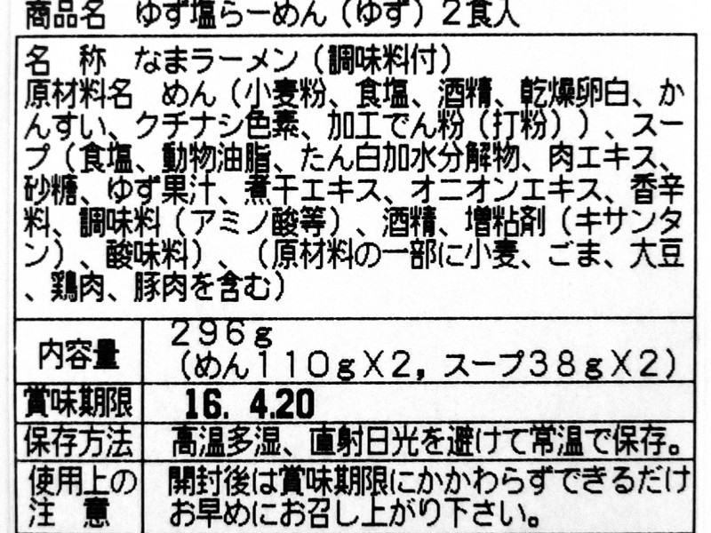 原材料 麺:小麦粉、食塩、卵白、酒精、かん水、クチナシ色素、加工でん粉(打粉)、スープ:食塩、動物油脂、たん白加水分解物、肉エキス、砂糖、ゆず果汁、煮干しエキス、オニオンエキス、香辛料、調味料(アミノ酸等)、酒精、増粘剤(キサンタン)、酸味料、カラメル色素、香料、香料抽出物