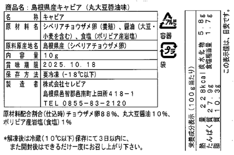| 原料の産地 | シベリアチョウザメ卵(島根県産)、醤油(島根県産) |