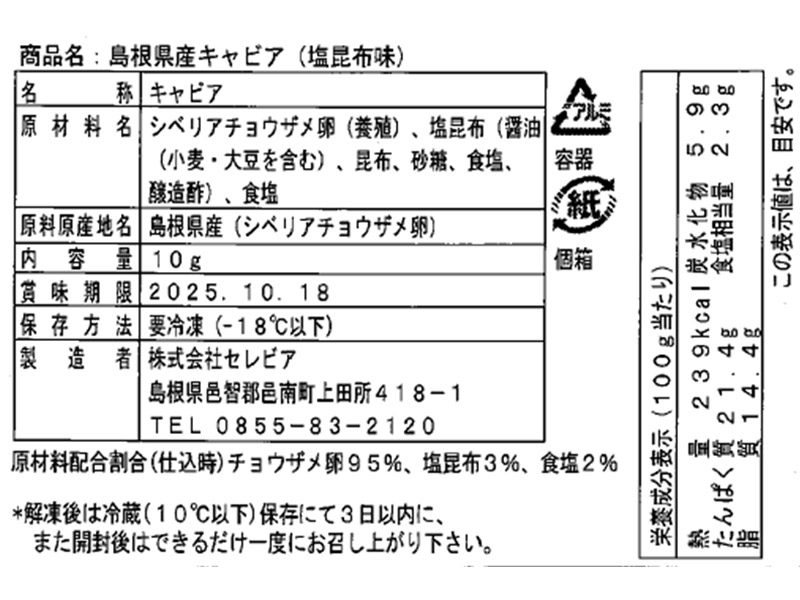 | 原材料 | シベリアチョウザメ卵(養殖)、塩昆布(醤油(小麦・大豆を含む)、昆布、砂糖、食塩、醸造酢)、食塩 |