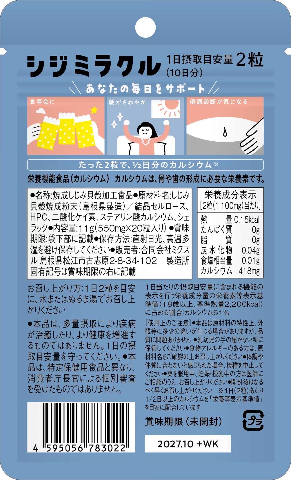 | 原材料 | しじみ貝殻焼成粉末(島根県製造)/結晶セルロース、HPC、二酸化ケイ素、ステアリン酸カルシウム、シェラック |