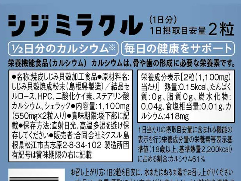 原材料 しじみ貝殻焼成粉末(島根県製造)/結晶セルロース、HPC、二酸化ケイ素、ステアリン酸カルシウム、シェラック
