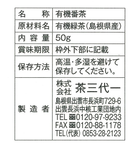 | 島根県産有機三年熟成番茶 | 50g | 20 |