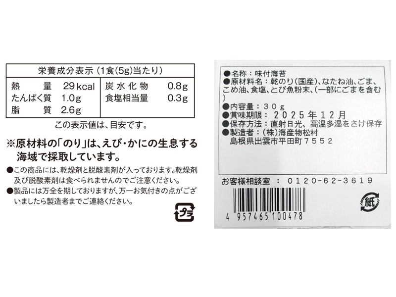 | アレルギー特記事項 | 原材料の「のり」は、えび・かにの生息する海域で採取しています。 |