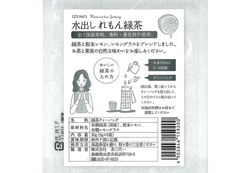 | 原料の産地 | 有機緑茶(島根県)、粉末レモン(愛媛県)、有機レモングラス(佐賀県) |