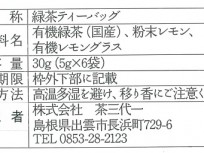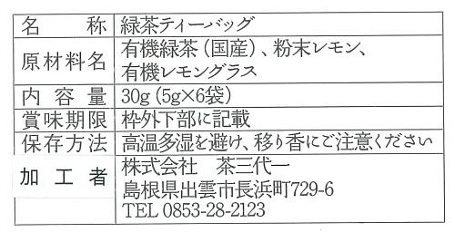 | 原材料 | 有機緑茶(島根県)、粉末レモン(愛媛県)、有機レモングラス(佐賀県) |