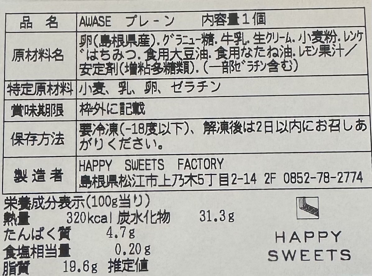 | 表示義務(8品目) | 卵, 乳, 小麦 |