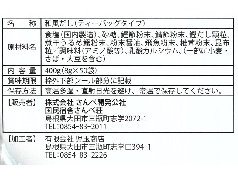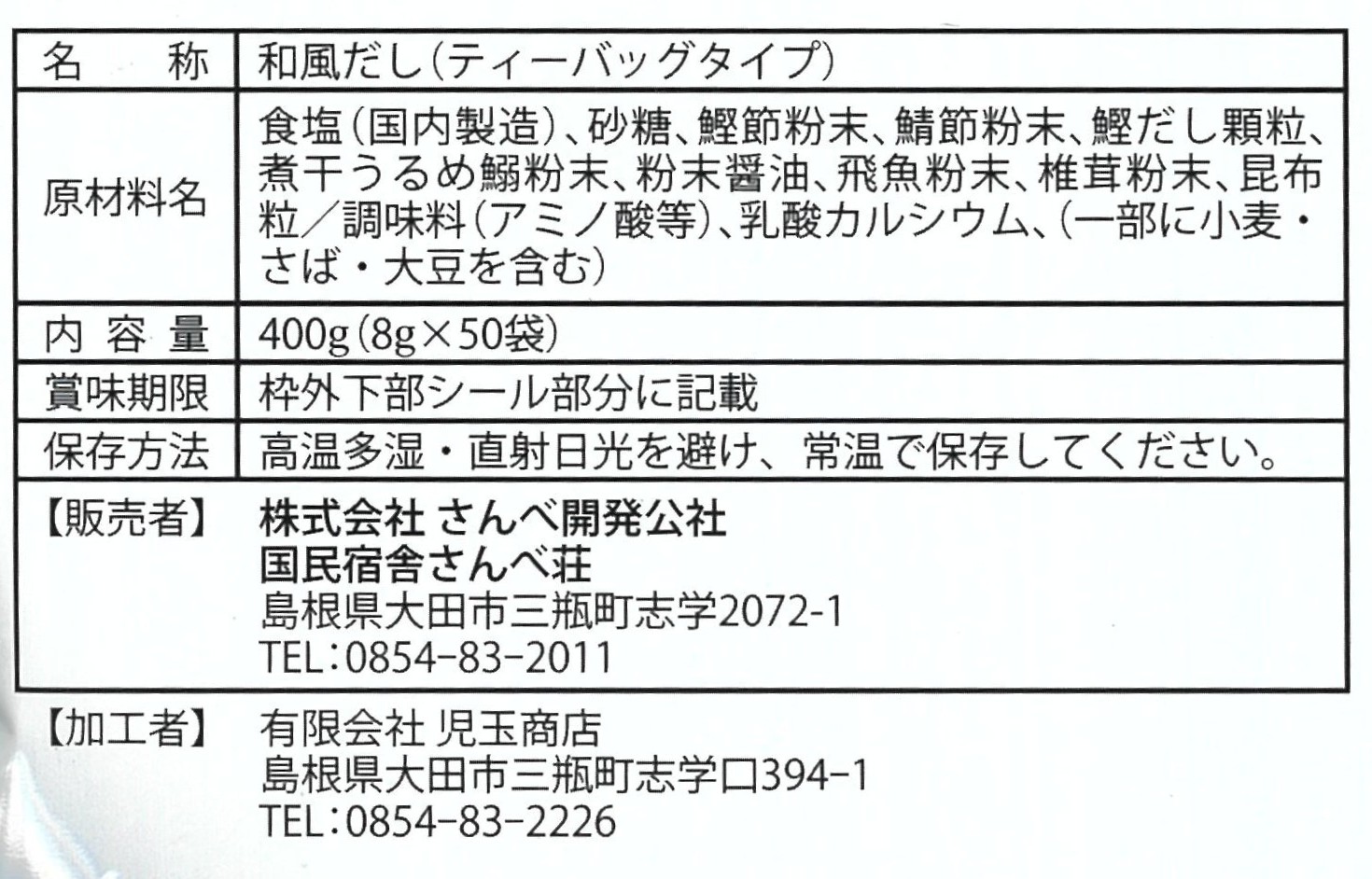 | 商品名(読み仮名) | しがくのおだし だしぱっく50ふくろいり 400g(8グラム50パック) |