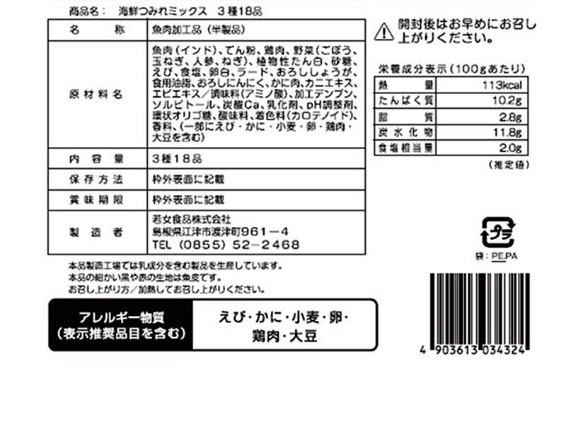 | 原材料 | 魚肉(インド)、でん粉、鶏肉、野菜(ごぼう、玉ねぎ、人参、ねぎ)、植物性たん白、砂糖、えび、食塩、卵白、ラード、おろししょうが、食用油脂、おろしにんにく、かに肉、カニエキス、エビエキス/調味料(アミノ酸)、加工デンプン、ソルビトール、炭酸Ca、乳化剤、pH調整剤、環状オリゴ糖、酸味料、着色料(カロテノイド)、香料、(一部にえび・かに・小麦・卵・鶏肉・大豆を含む) |
