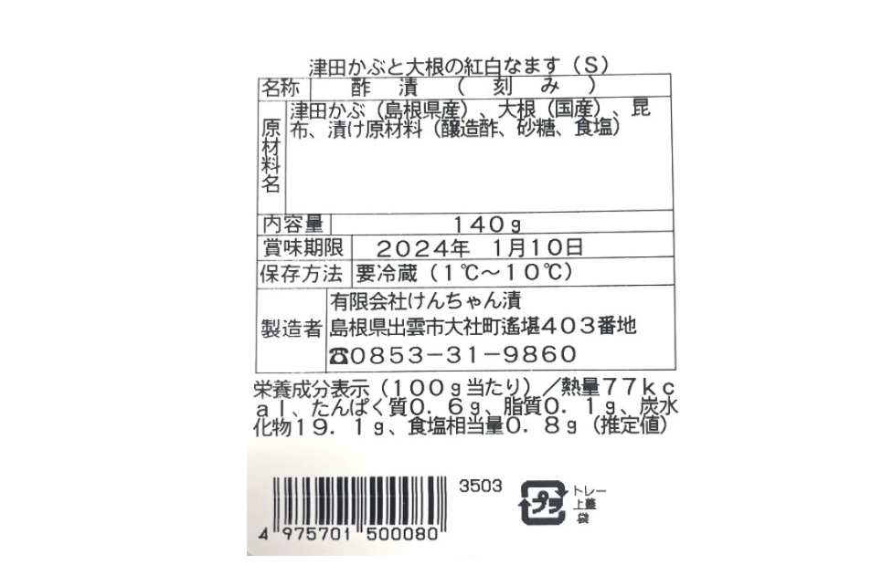 | 原材料 | 津田かぶ(島根県産)、大根(国産)、昆布、漬け原材料(醸造酢、砂糖、食塩) |