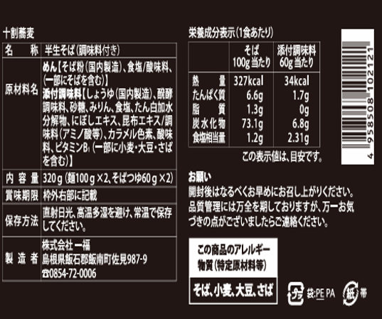 | 原材料 | めん【そば粉(国内製造)、食塩/酸味料、(一部にそばを含む)】 添付調味料【しょうゆ(国内製造)、醗酵調味料、砂糖、みりん、食塩、たん白加水分解物、にぼしエキス、昆布エキス/調味料(アミノ酸等)、カラメル色素、酸味料、ビタミンB1(一部に小麦・大豆・さばを含む)】 |