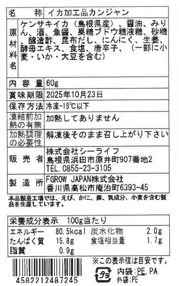 暑い日に醤油と唐辛子が食欲をそそる一品です。県浜田漁港で水揚げされた鮮度の良いケンサキイカを使った生珍味です。やわらかくねっちょりとした食感のイカで女性でも噛み切りやすいです。水揚げが減少している貴重な国内産のイカで作っています。