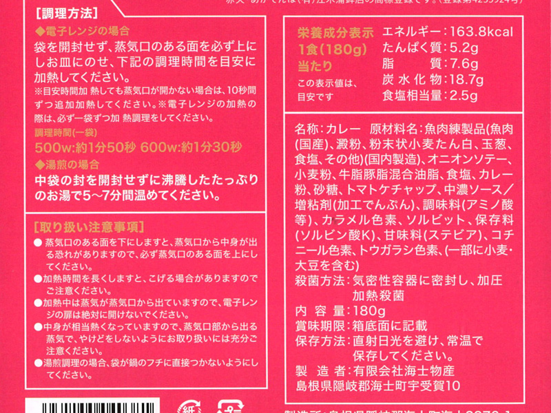| 原材料 | 魚肉練製品(魚肉(国産)、澱粉、粉末状小麦たん白、玉葱、食塩、その他)(国内製造)、オニオンソテー、小麦粉、牛脂豚脂混合油脂、食塩、カレー粉、砂糖、トマトケチャップ、中濃ソース/増粘剤(加工デンプン)、調味料(アミノ酸等)、カラメル色素、ソルビット、保存料(ソルビン酸K)、甘味料(ステビア)、コチニール色素、トウガラシ色素、(一部に小麦・大豆を含む) |
