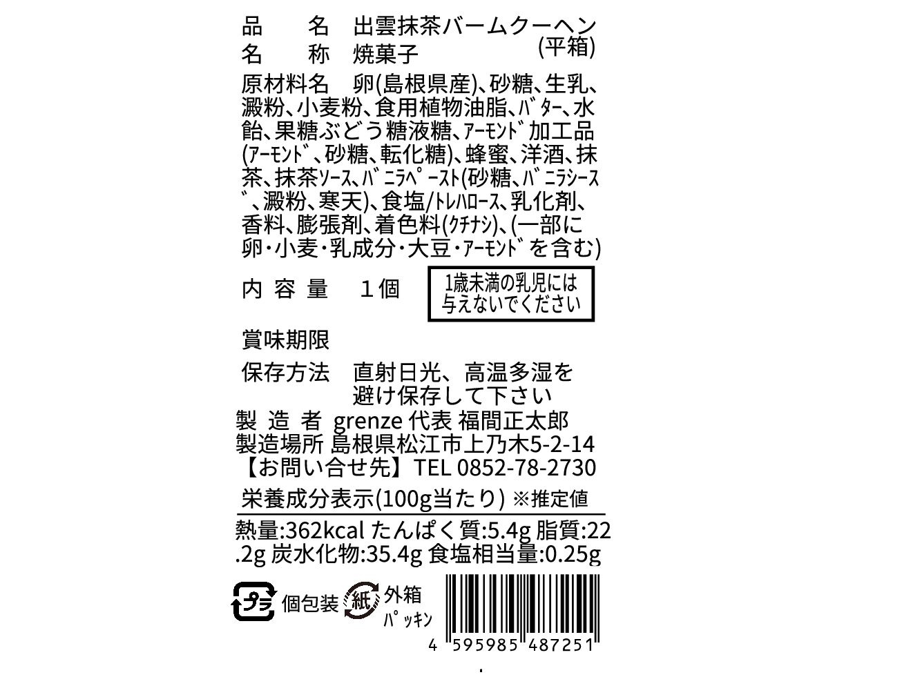 | 出雲抹茶バームクーヘン ホール1個入 | 1個 | 1個 |