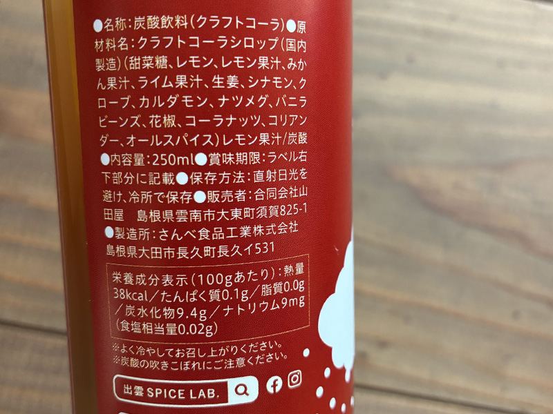 | 原材料 | クラフトコーラシロップ(国内製造)(甜菜糖、レモン、レモン果汁、みかん果汁、ライム果汁、生姜、シナモン、クローブ、カルダモン、ナツメグ、バニラビーンズ、花椒、コーラナッツ、コリアンダー、オールスパイス)レモン果汁/炭酸 |