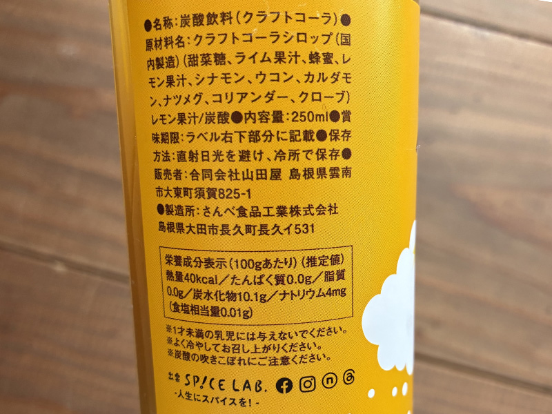 | 原材料 | クラフトコーラシロップ(国内製造)(甜菜糖、ライム果汁、蜂蜜、レモン果汁、シナモン、ウコン、カルダモン、ナツメグ、コリアンダー、クローブ)レモン果汁/炭酸 |