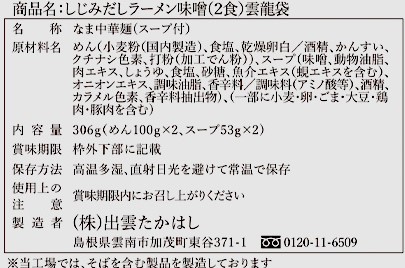 - しじみだしラーメン味噌 雲龍袋(2食)