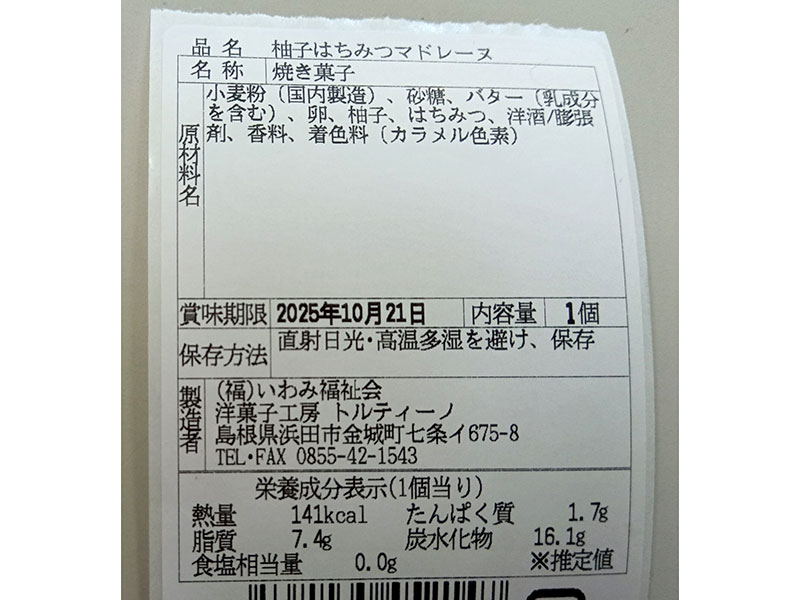 | 柚子はちみつマドレーヌ | 30g | ご相談ください |