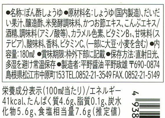 | 原材料 | しょうゆ(国内製造)、だいだい果汁、醸造酢、米発酵調味料、かつお節エキス、こんぶエキス/酒精、調味料(アミノ酸等)、カラメル色素、ビタミンB1、甘味料(ステビア)、酸味料、香料、ビタミンC、(一部に大豆・小麦を含む) |