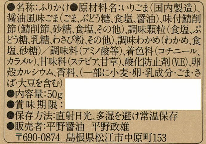 原材料 いりごま(国内製造)、醤油風味ごま(ごま、ぶどう糖、食塩、醤油)、味付鯖削節(鯖削節、砂糖、食塩、その他)、調味顆粒(食塩、ぶどう糖、乳糖、わさび粉、その他)、調味わかめ(わかめ、食塩、砂糖)/調味料(アミノ酸等)、着色料(コチニール、カラメル)、甘味料(ステビア、甘草)、酸化防止剤(V.E)、卵殻カルシウム、香料、(一部に小麦・卵・乳成分・ごま・さば・大豆を含む)