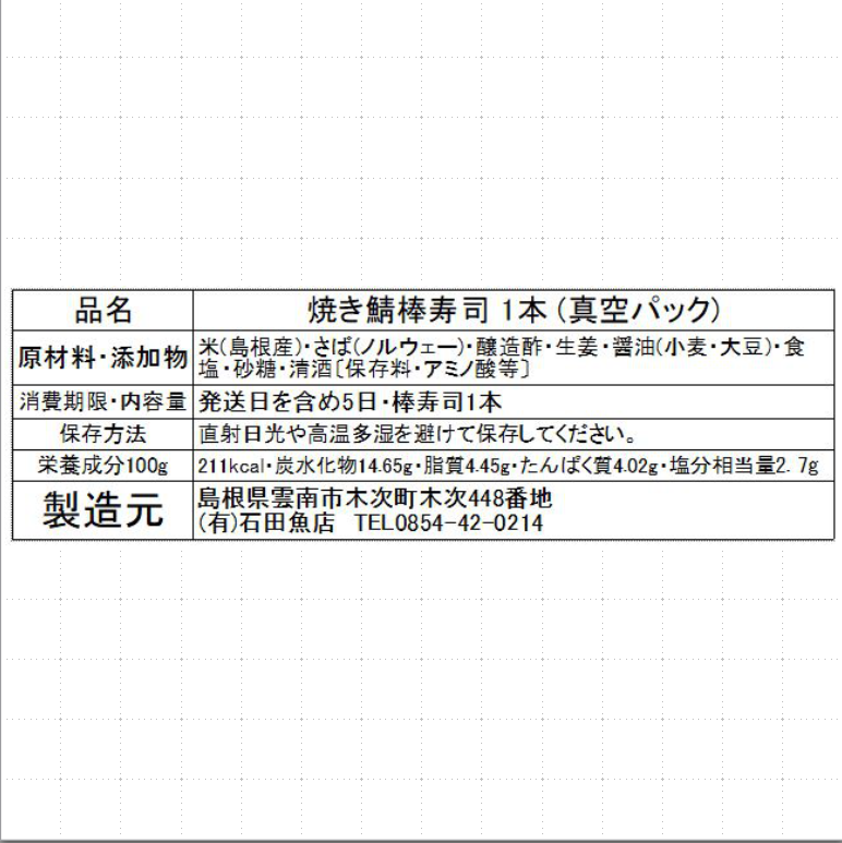 | 原料の産地 | 米(島根県産)、鯖(ノルウェー産) |