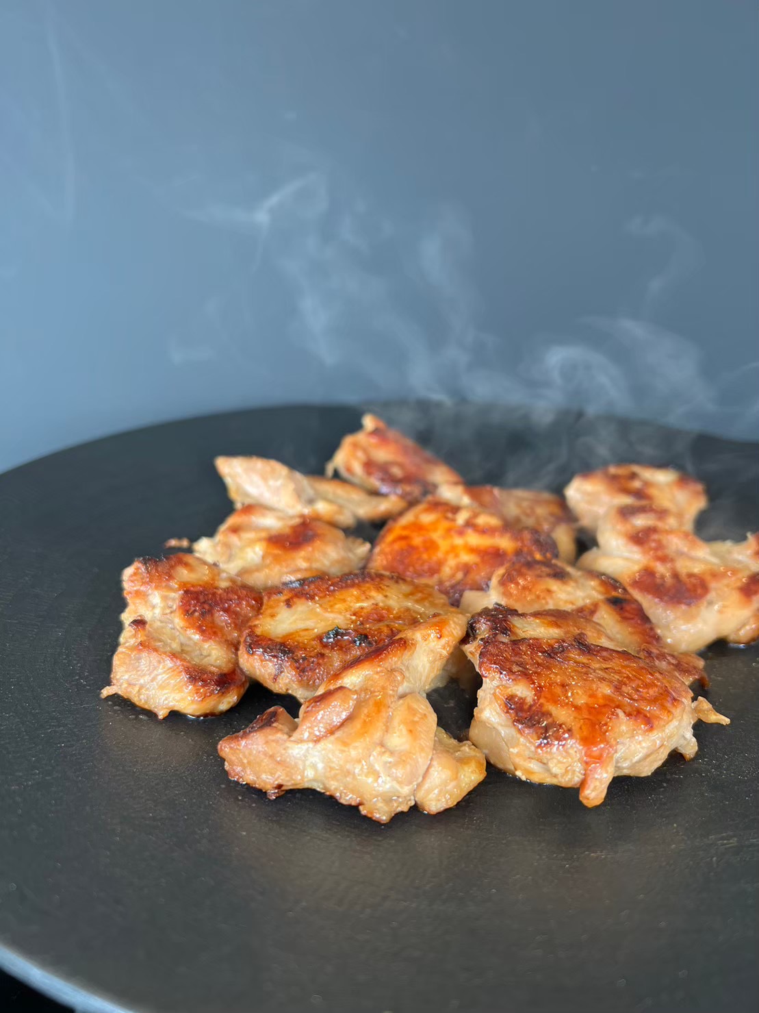 ハジメオリジナルのにんにく醤油ダレで漬け込んだ若鶏もも肉。解凍後、片栗粉で揚げるだけで本格からあげに!焼きでも美味。小分けで利便性抜群、子供からお年寄りまでみんな大好きな甘醤油味。パーティー、弁当、ギフトに最適!安定供給可能!