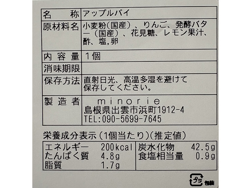 原材料 小麦粉(国産)、りんご、発酵バター(国産)、花見糖、レモン果汁、酢、塩、卵