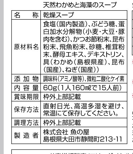 | 原料の産地 | わかめ(島根県産)、昆布(国産)、ねぎ(国産) |