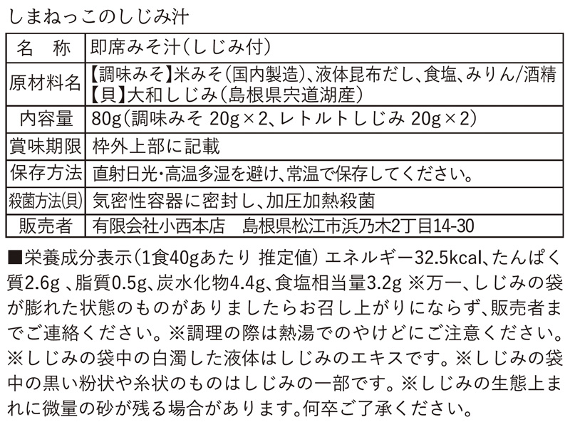 | 主なターゲット | ■地元産のお味噌としじみを使った松江のしじみ汁をお手軽に味わいたい方 ■国産原料のみで作られているお味噌汁をお探しの方 ■しまねっこファンの方 ■日々のお買い物を通して、無理のない形で動物保護活動を応援したい方 |