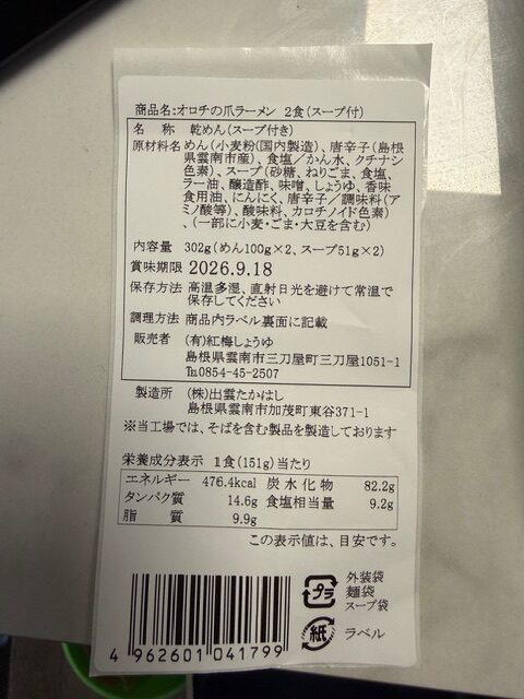 | 商品名(読み仮名) | おろちのつめらーめん2しょくいり |