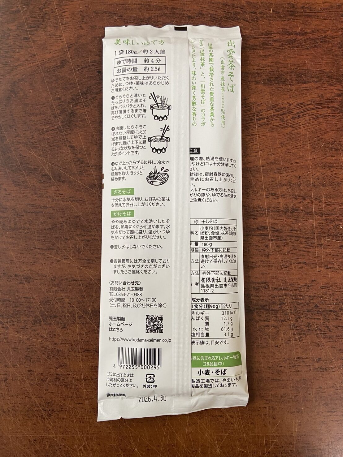 | 原材料 | 小麦粉(国内製造)、そば粉、食塩、抹茶(島根県出雲市産) |