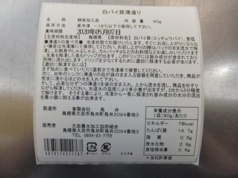 | 商品名(読み仮名) | 天然白バイ貝薄造り (てんねんしろばいがいうすづくり) |