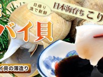日本海産の天然白バイ貝を1つ1つ丁寧に、職人技で薄造りにしています。さっとしゃぶしゃぶして野菜、薬味と一緒にポン酢でお召し上がり下さい。その他にカルパッチョや生茶漬けや雑炊など、使い方は自由自在。
