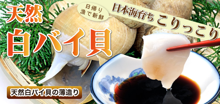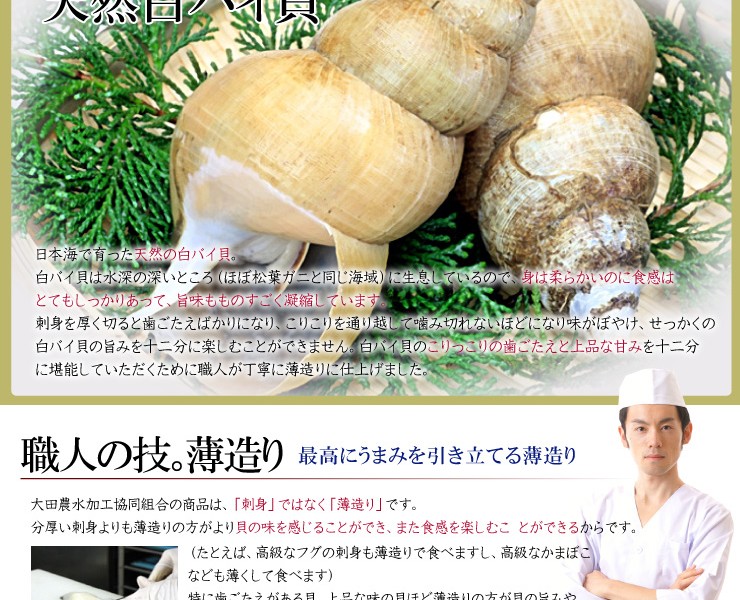 | おすすめメニュー | そのまま、薬味を挟みポン酢で薄造りとして。鍋に野菜を入れ、白バイ貝をさっとくぐらせしゃぶしゃぶに。〆にご飯と卵で雑炊に。または、暖かいご飯の上に乗せ、熱いだし汁を掛け、お茶漬けに。生野菜の上にそのまま乗せ、カルパッチョに。使い方は自由自在。(お皿の色は写真と異なる事があります。) |