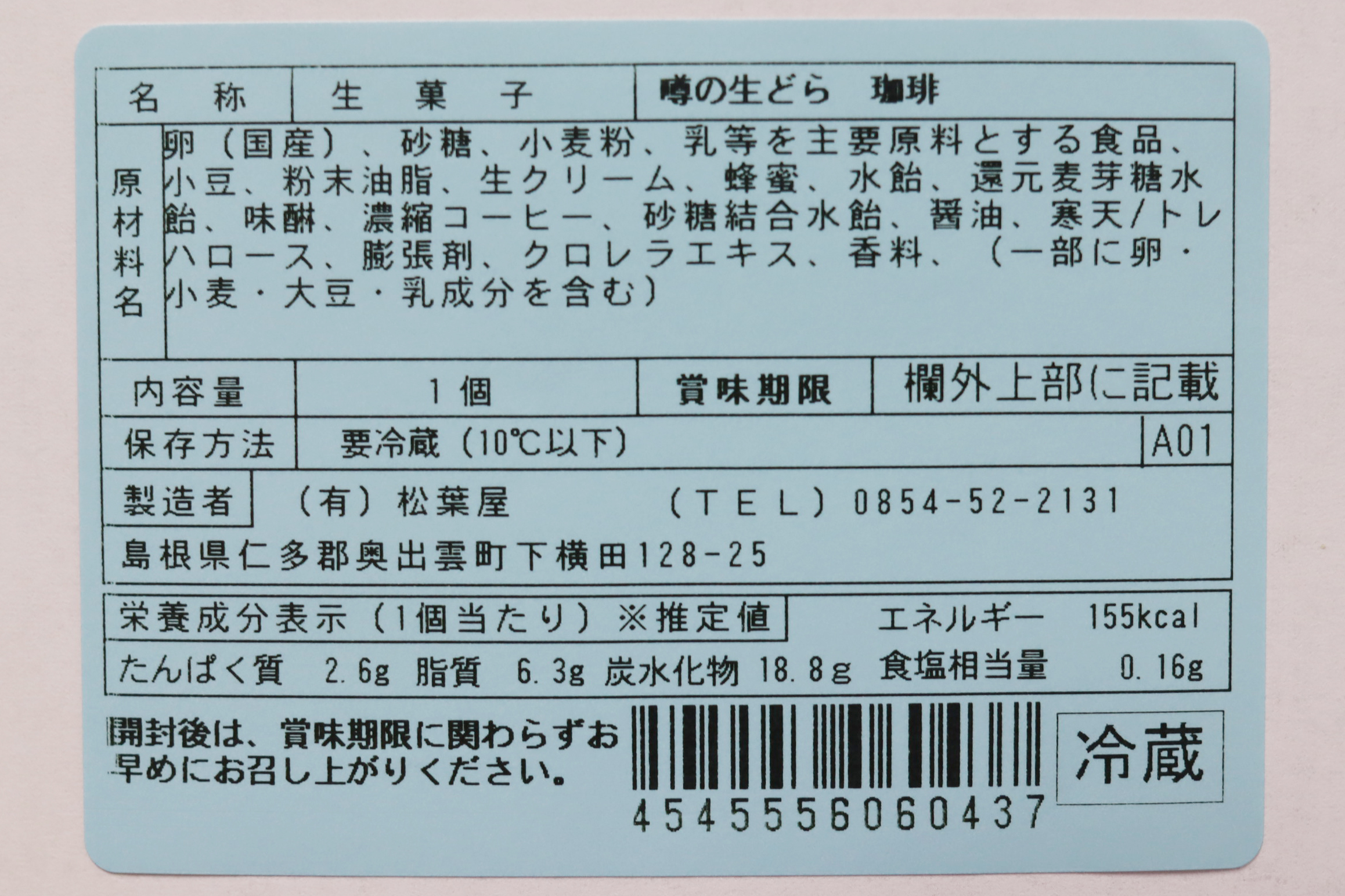 原材料 卵(国産)、砂糖、小麦粉、乳等を主要原料とする食品、小豆、粉末油脂、生クリーム、蜂蜜、水飴、味醂、濃縮コーヒー、砂糖結合水飴、醤油、寒天/トレハロース、軟化剤、膨張剤、クロレラエキス、香料、(一部に卵・小麦・大豆・乳成分を含む)